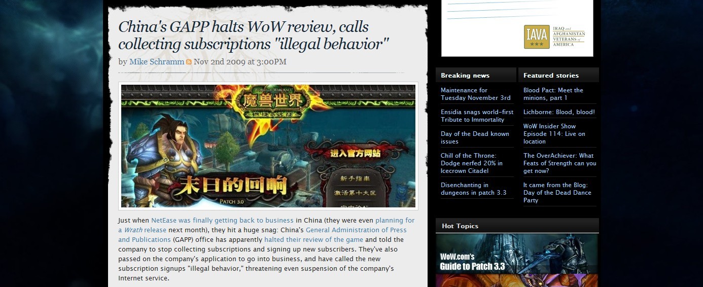 而另一个有名的魔兽世界资讯站wow.com也在第一时间放出了相关文章,详细报道了版署暂停魔兽审批,网易非法运营游戏的报道。同样在后面的国外玩家评论方面,玩家给予的也大多是同情,他们认为国服玩家比他们晚一年才能晚上WLK已经很悲剧了,停服的话,可能引起更大的问题,同时还有玩家对《魔兽世界》和《永恒之塔》做了对比,他们认为《魔兽世界》在国内就是个悲剧。