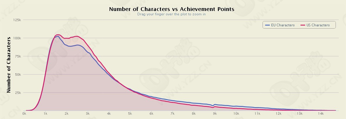4.3测试服已经正式启动,各路消息将陆续出台,关注叶子猪《魔兽世界》专区报道,把握《大地的裂变》最新动向! 我们常常看到在蓝帖里,设计师常常会说为了其他的玩家,所以我们要怎样怎样之类的云云,但到底有多少玩家是属于修仙状态?又有多少玩家非常热衷于魔兽世界?我们下面用一个简单的图表来分析。 依据国外著名魔兽网站MMO-Champion所做的调查统计,在美服360万人与欧服270万人的样本基数下,下面有三个统计图表来表现玩家的一些游戏行为。主要依据的是成就点数以及荣誉击杀,这两个数字都是属于累进数字,也就是说有多少的玩家在魔兽世界曾经努力过(并非现在)等于都计算在内了。 成就点数分布 点击图片浏览原图