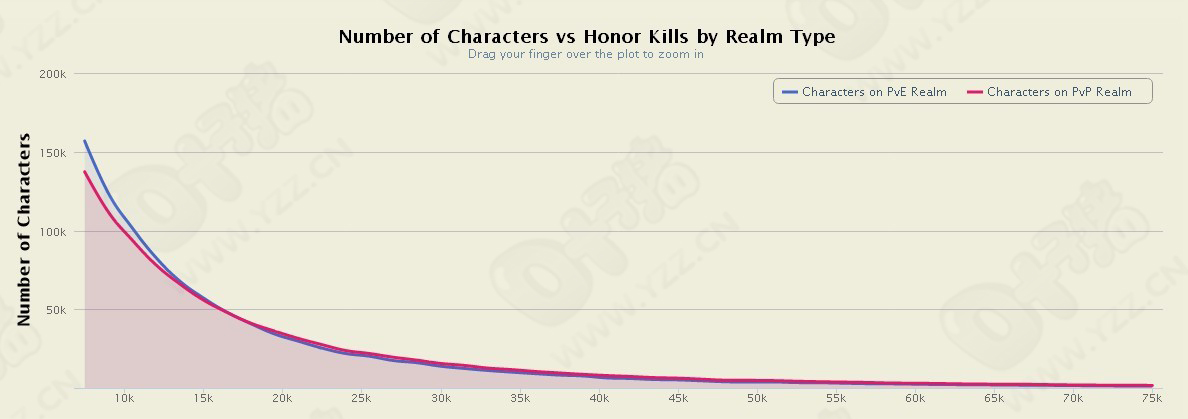 以成就点数来说,可以看得出来美服的休闲玩家(低成就点数)的人数比欧服来的多,而高分数的玩家则是欧服比美服更多,似乎可以说明为什么世界首杀总是由欧服拿下。而虽然后面看似人并不多,但欧服成就点数超过10000分的依然有上万人以上。而在休闲玩家上分别有两个高峰,代表着就是有没有在新的85级副本拿下一些成就点数。也就是说明显有一部份人对于成就,甚至对于副本是有些厌倦的。 荣誉击杀分布(阵营) MMO表示这个数字曲线上欧服与美服差不了多少,所以若依照阵营来看,整体来说部落确实比联盟玩家来的嗜血一点,但到了中高端其实没什么差,两边都一样的爱杀人。 荣誉击杀分布(服务器类型) 以PVP和PVE服务器来说,也是差不多的曲线,PVE的服务器确实较多人不碰PVP,但值得注意的是,欧美服的PVE服务器比例比起台湾高上非常多,所以整体来说,PVP服务器的人们也符合大家的印象,是比较嗜血的。 结语 虽然这是以欧美服作为基数的统计,但对于我们来说也有一定的参考价值,因为暴雪对于游戏内的改动,很多都是基于本地玩家的习惯来改进的。首先在成就点数的部分,成就点数没有任何的奖励,很明显的导致欧美玩家对于成就点数的不重视(这点台湾玩家也差不多),相信除了几个出团必要打通的成就外,多数人对于解成就这件事也是兴趣缺缺,至于在5.0后成就会整合进账号,未来更可能配合星海和暗黑的成就系统,能带起多少效应则是可以再观察。 另一个让人忧心的就是副本已经让玩家产生了倦怠感,从两个波峰显示很多人已经对85级的副本兴趣缺缺-不管再简单也一样,暴雪如何再造魔兽荣景,副本这个贯通魔兽的主轴不可或缺。 以总人数分析,再看PVP人数的分布,很明显的PVP式微很多,这主要在于暴雪的平衡策略,为求电竞发展,暴雪已声明不再重视PK的平衡性,这也导致很多玩家对于野外乱斗兴趣缺缺(碰到克住你的职业就没戏唱)。至于飞行坐骑小编个人认为,现在的影响反而不大了,即便是没法使用飞行坐骑的火源每日区域,也是打个几天就没下文了,飞行坐骑真正有影响的,也只有对那些喜欢趁隙补刀就跑的玩家。 推荐更多魔兽玩家趣闻阅读 |