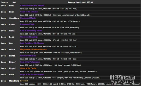 当饰品为常驻爆击的饰品(大嘴,水晶,常驻智力爆击,阿尔苏曼的预见)时将鞋子,腰带换为960装等主急速副全能。 全局设置:战斗时间350秒,时长浮动10%,战斗模式帕奇维克,迭代数10使用方法。 使用方法 第一步:找到对应饰品 第二步:找到对应装等,其中与图例装等一致的在颜色最末端,不一致的在两个图例装等之间的1/3(1/2)处