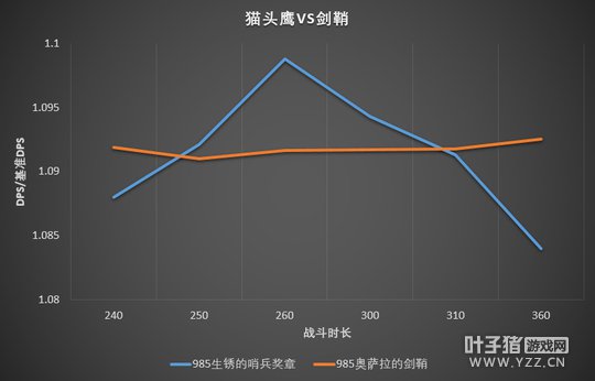 可以看到猫头鹰在开启主动特效时dps相对剑鞘开始上升,到主动特效消失时到达顶峰并开始下降。 并由图可得猫头鹰在(240*k+10秒——240*k+70秒,k∈N)为强势期。 剑鞘在(240*k+70秒——240*k+130秒,k∈N)为强势期。 取260秒战斗时长进行模拟: