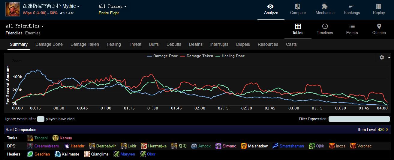 前言 本篇为测试服攻略 写于2019年5月31日,测试服版本8.2.0.30634,距离正式版本还有很长一段时间,技能/数据和正式服可能会有非常大的偏差 为了方便测试,进入 永恒王宫 装等会被自动调整到430,项链等级60 英雄难度前情提要 开战每个人玩家会中冰/毒的任意一种,每70秒还会随机变色 需要躲开场上所有异色技能:异色同伴,地上有异色水,BOSS会放异色标枪和异色冰刺 如果中了异色技能就会A全团 史诗难度不同点 奇美拉印记 在史诗难度下,深渊指挥官西瓦拉会持续施放奇美拉印记,使玩家持续叠加[冰霜烙印]和[剧毒烙印] 印记每秒跳一次伤害,1层3512,2层4740,3层6320,4层7900,5层9480,6层11060,7层12640,8层14220,9层15800,10层17380 中异色技能炸团,每跳伤害7787,一共跳三下 由两个伤害数值可见,暴雪的意图是希望我们频繁消层 在测试中,我们对于消层有两种思考方向: 1、各凭本事 那么全团分散随意站位,层数高于多少自己找异色水站进去消一下。 难点是BOSS放击飞,很容易把玩家击飞到异色水里/异色玩家身上,需要个人能力比较强 2、集中消层 BOSS的[致命弹幕]是一个有规律的技能,它放冰和毒的方向一定是:第一次左冰右毒,第二次左毒右冰,第三次左冰右毒(循环) 开战我们要求冰和冰站半场,毒和毒站半场;变色后,变色的人不动,不变色去对面 我们在每次BOSS放[致命弹幕]时,让全团站到BOSS脚下。坦克调整BOSS方向,让冰刺对着毒的人群,毒刺对着冰的人群。奶萨交LINK全团强吃消层 这个战术的问题是,由于是测试我们不清楚时间轴,又不是固定团缺乏默契,临时叫跑位有点艰难 其他 另一个没想到的超级难点是,在M难度中,毒的人移动涨能量太快了,我目测了一下,连续移动超过3秒就会被迷惑 这直接导致毒BUFF的人放水贴不了边,变色跑不到对面半场 冲锋也算移动,点门也算移动,很绝望 我们测试中带了俩老外,他们上不了YY也听不懂中文,导致我们的各种战术安排都无法有效得到执行 EKK每灭一把,含着泪在团屏给他们敲一堆E文,但是毫无反应 测到第二个BOSS才发现原来是俩毛子,还是俩E文很破的毛子,很绝望~ 这种战斗机制下,无法沟通意味着:一个异色在一群同色里炸的鸡飞狗跳 我想了想正式服开放后,地狱难度的集合石团,觉得大家还是别对这个M1有太便当的期待为妙 最后是吐槽 在这次M测试中,打坦克叠层的技能[碾压回响]变成不可驱散 奶僧的还魂精华天赋终于有救了 视频 时间轴 ![]() WCL [编辑:大主顾]
