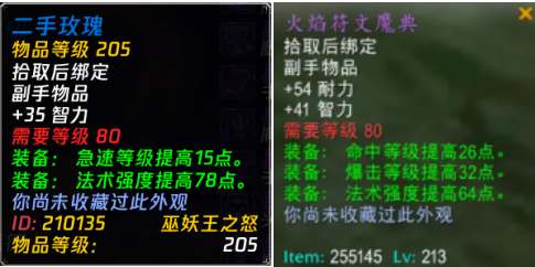 12月4日将正式开启魔兽时光服首个团本“熔火之心”,而据各个玩家群透露,所有团长明确表示将“顶门”进本参与首杀,尤其是时光2与时光3的主播团,都已经摩拳擦掌准备就绪。保守估计本周团本一开,这两服的排队情况会越发严重,说不好上午9点就开始排队,上班族想要首日打通MC估计得找人代排了。 但话又说回来,除了这一波先头部队以外,其实还有一批等着叮号的玩家,因为他们实在是没空练号,只能等18号直升。更何况直升80级送一套全身205装备,从目前挖掘出来的数据来看,属性并不差,足以应对MC所有BOSS。 首先是各个护甲的部位,主要分两种,一种是带有耐力属性,另一种则没有,相比5H的200装等蓝装要好一些。当然,想要冲榜WCL必然要换全套紫装。 大部位头、腿、肩属性如下: 然后是直升送的205武器,大部分近战武器都带有精准属性,前期过渡十分好用,性价比很高。 锤子: 弓: 匕首: 接下来看看四个职业的圣物,其中值得关注的是死亡骑士的两大魔印“二手冰冷良知魔印”和“二手野鹿魔印”,一个是DKT,另一个是邪DK,其属性都比原来的高出不少,如果后面没有更强的魔印就可以宣布全版本BIS。 死亡骑士: 萨满: 德鲁伊: 圣骑士: 另外,有一件比较离谱的装备是这个飞刀,属性却是增加“远程攻击强度”,有没有一种可能是显示错误呢? 除了飞刀以外,还有一件看不懂的装备,205蓝装法伤竟然比213紫装高出14点。 最后看一下直升205戒指和饰品,单看属性可能一般,但由于MC掉落的213装等“法术能量之戒”是加74法伤和回蓝属性,两者对比起来,各有优点。 饰品方面也是有四个,属性比起主流饰品差得有点多。只可惜,MC不掉落物理饰品,导致P1阶段能用的不多,要么牌子饰品+卡牌,要么拿五人本的蓝色饰品,建议叮号的玩家还是先用着吧。 总的来讲,直升送的205装备主要意义是让玩家第一时间进本,属性虽有瑕疵,但也能用,符合直升赠送的水平。 [编辑:月光下完美]