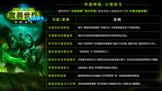 军团再临:幻境新生的时间线开始崩塌,就在此刻道别并拥抱混乱吧。 “永恒回响”更新详情 永恒沙漏再次倒转!当军团的余音在命运的流沙中回荡,世界因期待而感到战栗。是时候大步迈入“军团再临:幻境新生”:永恒回响了。每一次心跳都激荡着新的可能,连时间线也将屈从于你的意志。 本次更新旨在让升级之路更丝滑,奖励获取更丰富,同时带来全新的挑战,并为这段旅程画上圆满句号。以下是你不可错过的精彩内容。 省流版 无瑕的时间帛线: 编织传奇:寻找闪耀的无瑕的时间帛线——这个关键道具可以将你的装备强化至璀璨夺目的779物品等级。通过你的英勇征战获取它们,或者直接拆解满级装备。 艾鲁斯的拆解服务: 当你的背包装满了微粒和帛线,不妨去找找艾鲁斯。他新开张的拆解服务能帮你把多余的微粒和帛线转化为粉碎的纪元挑战纪念品——这可是珍贵的勇气代币,每十个一组出售。 时空奔行者的狂欢: 对知识的渴求有了新回报!投身永恒研究任务,赢取强效的“时空奔行者的狂欢”——这是一种强大的增益效果,每层提供3%经验值加成,持续12小时,且最高可叠加10层。抓紧时间,快速提升你的等级! 莫拉塔丽的新任务: 所有的线索都指向永恒集市上神秘的莫拉塔丽。对于那些已经完成入门任务的勇士,“若如初见”与“时间所剩无几”任务正静候你的到来。随着永恒传奇渐入尾声,它们将为你带来终局的答案与未来的希望。 告别永恒龙军团事件: 随着永恒龙军团的使命走向凄美的终章,英雄们受邀前往永恒篝火旁,参与焚烧空白的末日预言者小册子的仪式。这一象征性的举动不仅标志着旧时代的落幕与新命运的铸就,更是所有时空奔行者回首过去、拥抱未来冒险的时刻。 失落军团地狱火: 随着失落的军团地狱火轰然坠落,战场为之震颤。它们是来自被遗忘时间线的混乱先驱。这些稀有精英正在大地上肆虐,每一个都守护着全新的战利品,等你前去夺取。 来自其他时间线的世界首领: 每过十八小时,来自无数时间线的六位世界首领便会降临,每一位都带来了全新的挑战,当然,还有丰厚的奖励。 加速狂欢: “军团再临:幻境新生”的节奏全面提速。准备好迎接更丰厚的战利品掉落、遍布各地的时空扭曲方尖碑吧,它们将助你一臂之力。别忘了,拆解最高级装备还有机会获得“无瑕的时间帛线”。 获取军团再临:幻境新生 的各种奖励 住宅装饰 军团再临:幻境新生为你带来收集各类新物品与回归物品的良机,更有全新住宅装饰可供获取——这些装饰将在“地心之战”内容更新上线后启用。 玩家还可以获得“时序学者”、“狱火使者”、“永恒混乱的”等头衔。 更多角色栏位,更早角色转化 我们会为所有《魔兽世界》账号添加五个新的角色栏位,方便大家创建更多角色。现在玩家也无需等待军团再临:幻境新生结束,即可将角色转移到“地心之战”中。 转移过程是单向的,在跨越时间线之前一定要慎重思考。一旦将一个幻境新生角色转为标准角色,角色将无法再体验幻境新生:军团再临的内容。 转移角色会移除所有幻境新生专属的物品和技能,清空任务日志,并为角色提供与等级相符的装备和金币。 所有你收集的传承物品,包括尚未打开的收藏品,都会通过邮件寄送给你。 要转化时空奔行者角色,你需要在角色选择界面中选中此角色,随后点击一旁的转化图标。需要注意的是,只有创建时间达到24小时的角色,才能转化为《魔兽世界》的标准角色。 如果你还没有加入时空奔行者的队伍,可以点击此处查看往期军团再临:幻境新生的相关攻略内容,在时间线彻底崩塌之前,体验全新的冒险旅程。 搏击俱乐部回归 等你前来挑战 在勇士们拯救卡雷什期间,搏击俱乐部也在对他们的斗士进行秘密特训,如今,搏击俱乐部正式回归,并且等待着各位的挑战。 地点:奥格瑞玛搏击竞技场或暴风城矿道地铁的比兹莫搏击俱乐部。 入场资格:80级,拥有浸血的邀请函。 获取浸血的邀请函 挑战搏击俱乐部 你可以前往多恩诺嘉尔(51,43)【念叨的拳手】处接取任务。 随后前往奥格瑞玛或暴风城,跟随指引完成任务即可获取邀请函,使用邀请函即可获得上台资格,前往搏击俱乐部进行挑战。 报名参赛,击败对手 一切准备就绪后,与俱乐部中的搏击竞技场步兵(部落)/比兹莫搏击俱乐部保镖(联盟)对话即可进入队列等待入场,切记不要插队! 挑战共有四种模式:个人排位赛、满级定制赛、随机挑战赛和经纪人挑战。完成个人排位赛后即可解锁后续模式。 全新的奖励 如果你想要感受最具冲击力的飞行,现在机会来了!在搏击俱乐部挑战各路对手,击败他们达到响当当的8级,就可以在搏击俱乐部军需官处购买脱缰野马飞弹,如炮弹般出膛! 参加搏击俱乐部还能获得拳手的金币,可以用来购买解锁额外挑战的物品,还能为你和竞技场的其他选手带来共同的增益等等。 或许你会经常战死在拳台或者被观众扔臭鸡蛋,不要气馁,只需要将出现在眼前的对手全部打败,成为搏击俱乐部的真正明星吧! [编辑:月光下完美]
