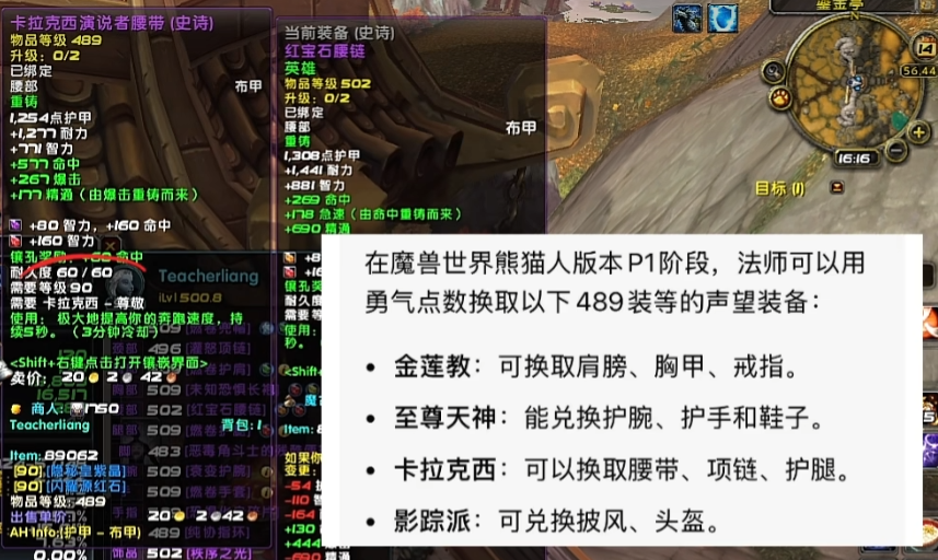 今日,魔兽怀旧服正式开放熊猫人之谜(MOP),不少玩家早上6点就前往潘达利亚开启升级之旅,而如今85到90级的经验被砍过以后,仅需要10个小时就能满级。当然,如果你是一名“海归”的熟练工,甚至可以提前到8小时。话不多说,下面简单地讲解一下练级到90后需要注意的几个地方。 1、练级前你需要知道的 虽然不少玩家回归后,还惦记着传家宝,只可惜传家宝不能升级到90级,目前想要获得经验BUFF只能通关马戏团。玩家坐上旋转木马一段时间即可拥有10%经验BUFF,要注意的是,角色阵亡后BUFF会消失,需回到马戏团再次领取。 2、升级线路与小技巧 据老前辈反馈,最科学的升级方式是边做任务,边排随机本。一来不会太过枯燥,二来随机本给不错的过渡装,两者结合相辅相成。做任务先从翡翠林—四风谷—昆莱山—螳螂高原—恐惧废土,切记升一级换一个图,任务经验会高很多。 另外,当你来到昆莱山时,记得把锦绣谷开门任务也接了,位置在白虎寺的主殿内,联盟和部落对应不同NPC。当然,满级之后回来做也是可以的,反正这个任务必须要做。顺便一提,经过的玩家不妨去下图标红的位置看看,捡起一把锤子就有28W经验。 3、关于声望、日常和好运币 在熊猫人版本里,声望附魔已经没有了,日常获得的勇气主要用来换取489装备,不同声望对应着不同部位,一般情况下只需尊敬即可。每做完一个日常任务会获得一定数量次级好运币,攒够50个再次与NPC对话即可获得一个好运币(BOSS倒地ROLL一发有概率获得装备),每周上限3个。所以玩家满级后,还得每天上线清一轮日常。 4、世界BOSS与天神副本 P1阶段有两个世界BOSS(炮舰和怒之煞),掉落496装等,一周打一次就行,属于个人拾取。同时,世界BOSS是可以使用好运币,但不建议浪费在此,ROLL到装备的概率实在太低。 另外,天神本需要435装等才可以排,随机奖励分别是240点勇气和4片至尊石碎片,这个碎片同样能换装备,比如476的武器、饰品。但目前国服还没开放,估计等周四团本一起开。 最后说说团本魔古山宝库,据留学归来的玩家反馈,第一周想要全通H模式是地狱难度,当时亚服不少团队都要7、8个小时才打通,再加上国服周四就开团本,大部分玩家都不够时间去提升装等,硬件不够的情况下去打可太难了。 [编辑:月光下完美]