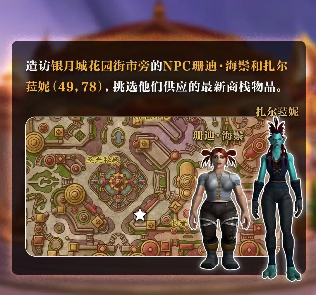 无论你是在艾泽拉斯享受最好的生活,还是仍沉浸在情人节的余韵中,亦或是正与好友在冒险中开怀大笑,三月商栈都将是你不可错过的去处。 参与丰富多彩的活动,赢取本月奖励——由埃德尔鲁·夏叶亲手编织的舒适的贝拉梅斯飞毯坐骑。 二月周年纪念分销即将结束!如果你还有心仪的物品尚未入手,现在还来得及。 请在三月商栈正式更替前,立即前往进行最后的采购!点击此处阅读此前发布的文章,查看完整的库存清单。 舒适的贝拉梅斯飞毯(坐骑) “埃德尔鲁·夏叶的手织毯子在贝拉梅斯的孩子们中间很受欢迎。” 完成活动,填满冒险指南(Shift-J)***中的旅行者日志顶部的进度条,就能获得本月的额外奖励——舒适的贝拉梅斯飞毯坐骑。 坐骑 舒适的银月城飞毯 “女裁缝蔻妮·琥珀之光的魔法毯子成了银月城贵族子弟竞相购买的潮品。” 护甲幻化外观 精致赤红魔纹布 "怀特迈恩在血色十字军成员中引领了一股着装潮流……" 血红帝王蝶之翼 “这些翅膀是月莓女勋爵送给灰烬王庭的礼物,是将野性之魂浸泡在纯粹的罪业之池中制成的。” 武器幻化外观 从左至右:姐妹会的新月刀、女猎手的月刃剑、姐妹会的月之矛以及女猎手的月刃剑 单手剑、单手剑、长柄武器以及单手剑 姐妹会的战刃 、女猎手的月刃为恶魔猎手专属武器,价格为每个80枚商贩标币。 访问暴风城法师区外的陶妮和怀尔德商栈**,或者造访奥格瑞玛格罗玛什要塞旁的赞希里商栈,挑选他们供应的最新物品***。 玩家也可前往位于多恩岛主城多恩诺嘉尔,拜访位于铸炉园的商栈,以及焕然一新的银月城(随“至暗之夜”同步开启)的商栈:陶妮和怀尔德商栈与赞希里商栈的代表已经在此开门营业。 在每个月的月初,拥有游戏时间且记录良好的玩家可以打开收藏者的宝箱,自动获得500商贩标币。 如果你的账号没有游戏时间,或者在月初并未拥有订阅,也不必担心。在拥有游戏时间或激活订阅的第一天,你就会获得当月的标币。 所有人获得的标币数量相同,与游戏时间的获取方式无关。 完成全新旅行者日志中的月度活动。每个月都会轮换推出一系列主题活动。参加这些活动最多可额外获得500商贩标币。 每个月完成活动所能获得的标币数量是固定的,所以你无需完成每月的全部活动。你可以选择多种有趣的活动,从而轻松获取标币。 玩家可以通过完成任务、参加战场、参加假日活动甚至挑战史诗钥石地下城,以当前的玩法获取标币。不过你也可以选择参加为本月专门设计的活动。 在每个月结束之前,如果你还没有购买那件“不愿错过”的物品,也不用担心!你可以“冻结”一件物品,以待日后购买。冻结一件物品后,它在每个月都不会下架,直到被购买或替换为止。 如果本月的精选物品中没有你心仪的物品,也可以留着你的商贩标币,等待以后使用。商贩标币不会消失,未使用的标币每个月都会累积。 [编辑:月光下完美]