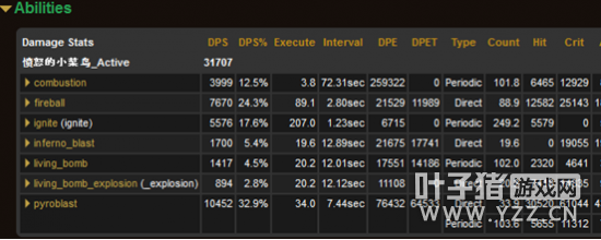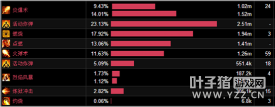 传说中的1+1 1.2.2伤害构成 下面我们来分析正常情况下一场战斗的伤害组成,并由此展开我们对火焰专精伤害机制的研究。 单体: 火法的正常单体输出循环,比例大致应当是这样: