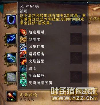 元素回响:熔岩爆裂、地震术、风暴打击、熔岩猛击、火焰新星、激流、生命释放和灵魂链接图腾拥有2层效果。 所谓的2层效果即2层充能,当你用掉第一次时冷却时间开始计算,如果两次技能都使用的话,必须等到第一次技能冷却后才会开始第二次技能的冷却。 另一个情况,元素专精下熔岩奔腾触发后,如果不足2次充能,则奖励1次充能,如果已经是2次充能则没有额外充能次数,只有1次瞬发机会。 在选择了专精后,天赋会显示受到影响的技能。 元素专精: